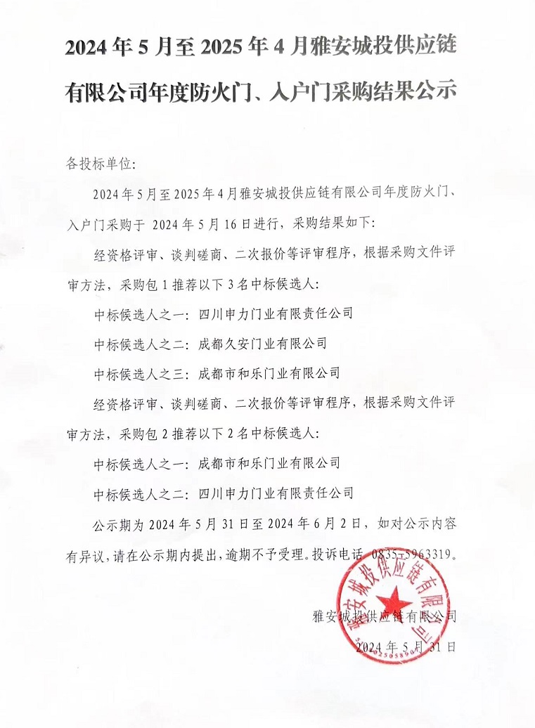 2024年5月至2025年4月雅安城投供應(yīng)鏈有限公司年度防火門(mén)、入戶門(mén)采購(gòu)結(jié)果公示
